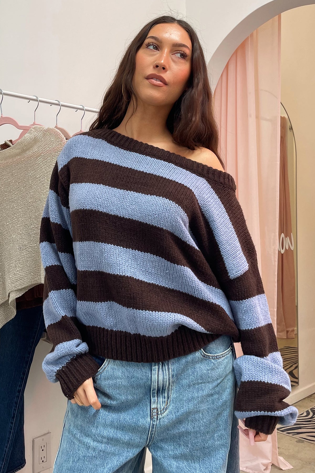 Blue and brown stripe off the shoulder knit sweater