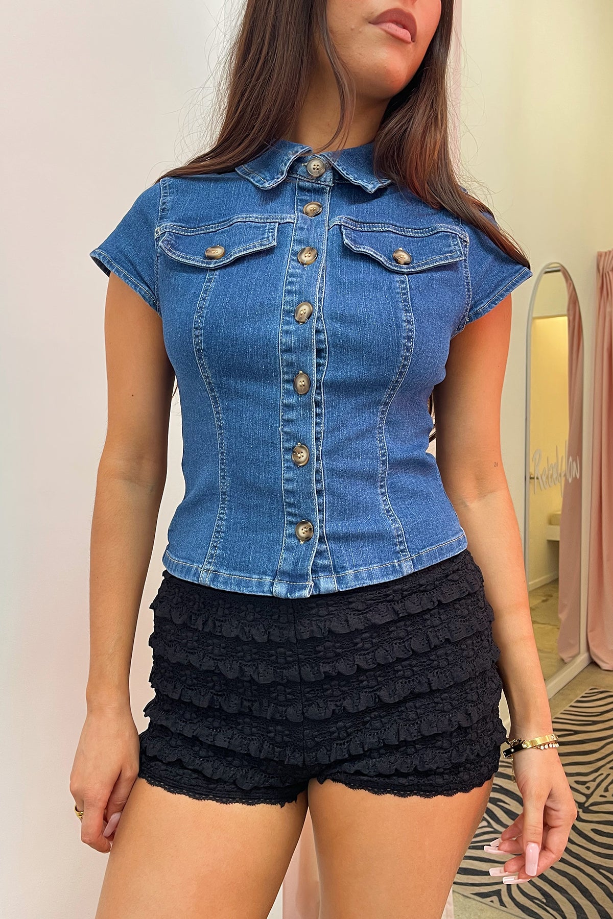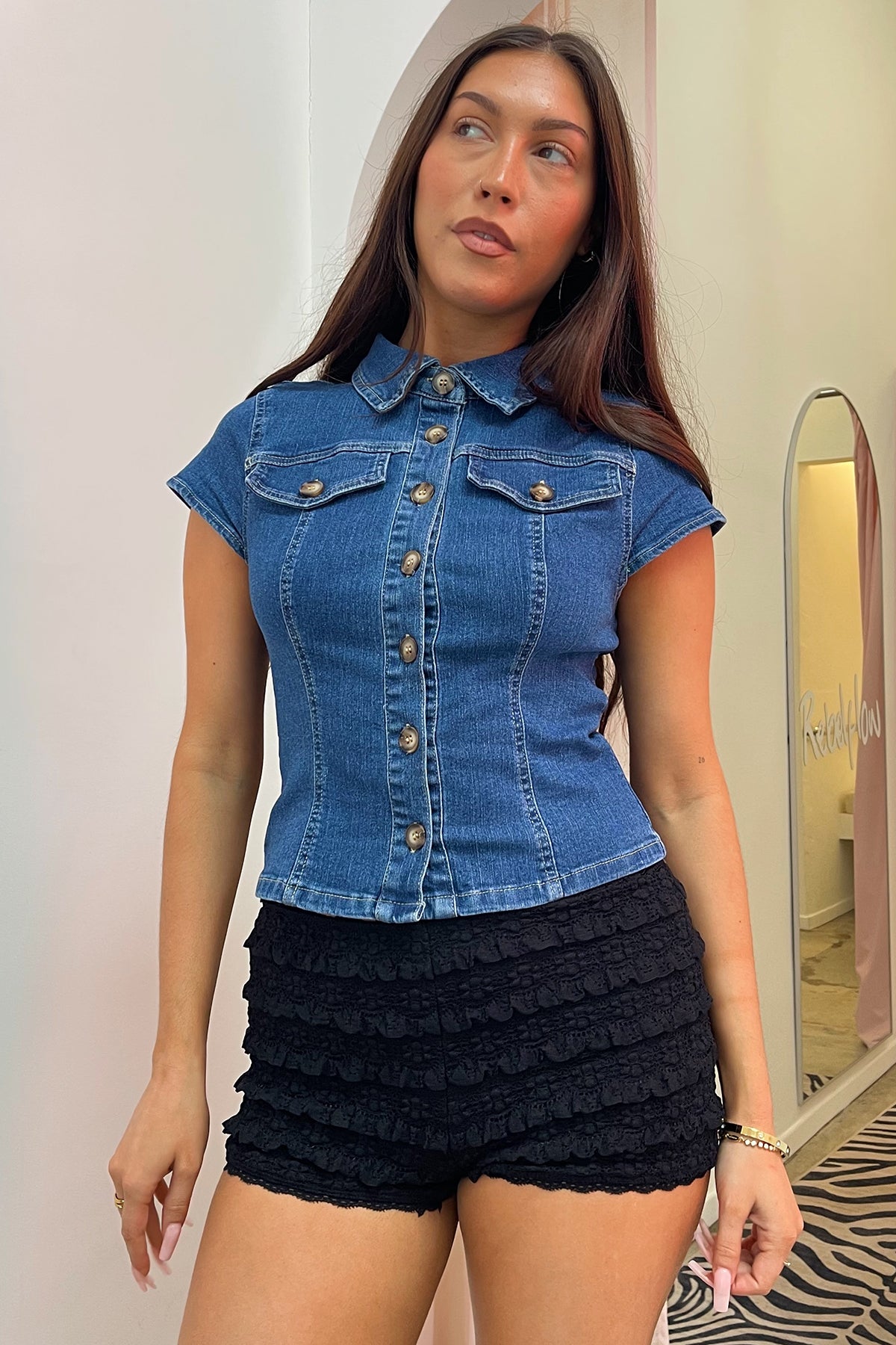Blue denim button up collared top