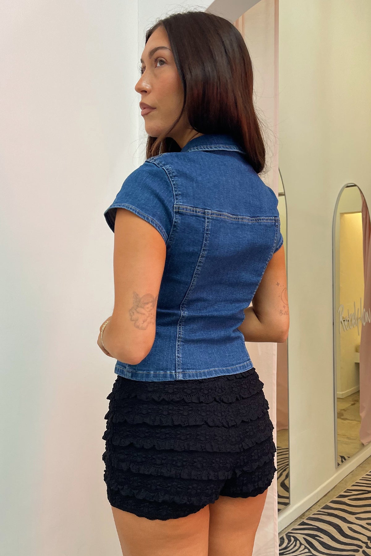 Styled with the Sahara Black Lace Trim Mini Shorts.