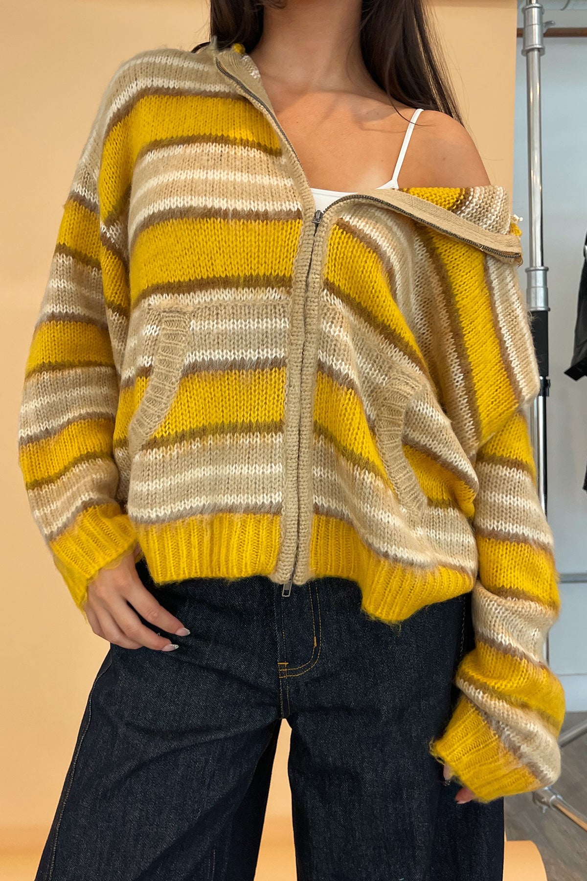 Yellow and taupe stripe fuzzy knit zip up hoodie