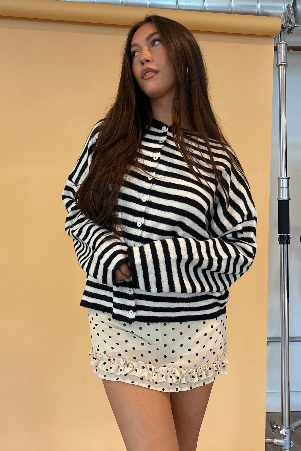 Styled with the Romy Cream with Black Polka Dot Ruffle Mini Skirt.