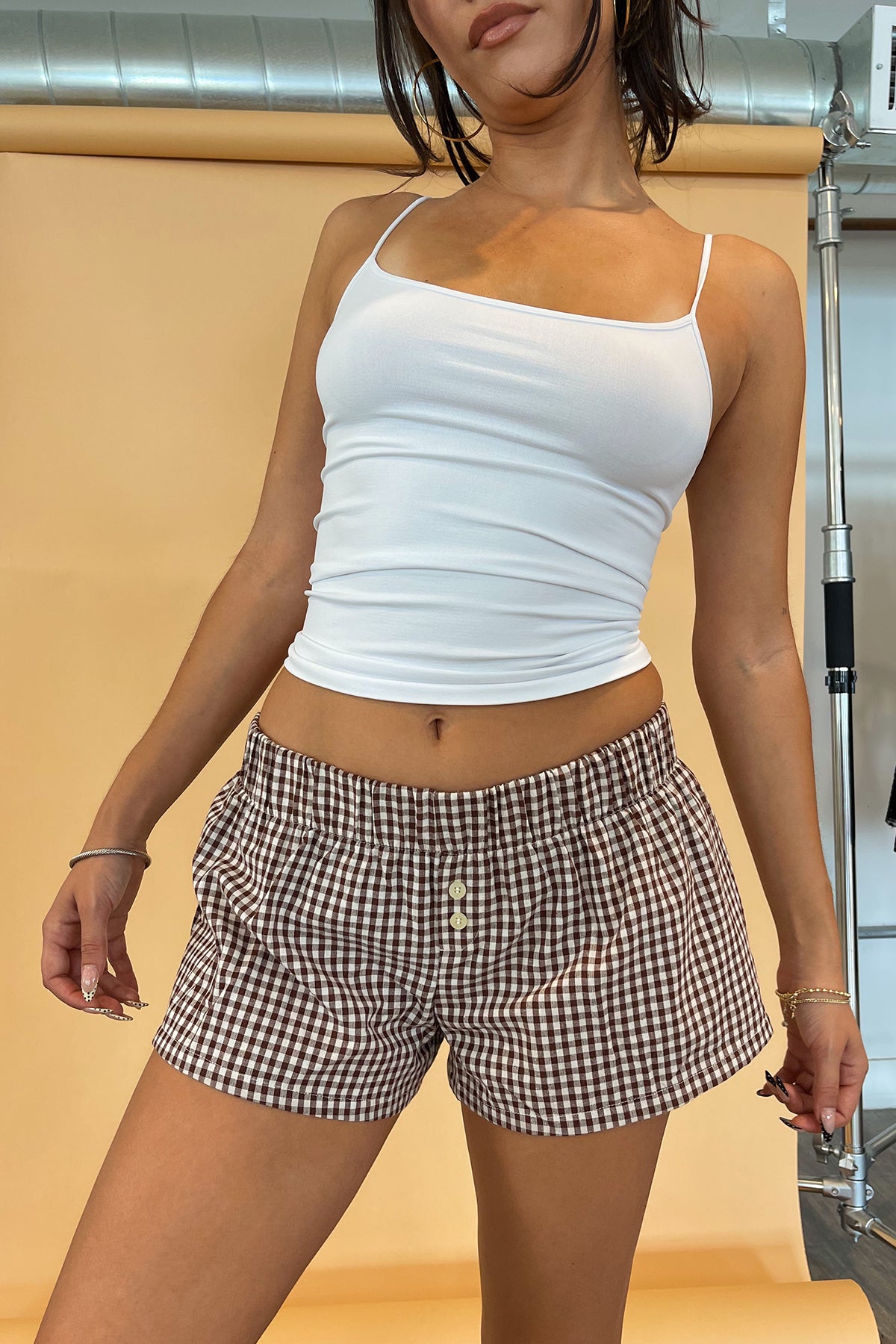 Brown gingham boxer style mini shorts